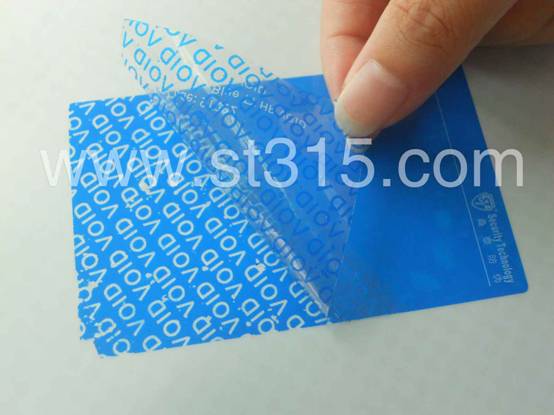 桑泰9T202防偽材料被揭起后,會有藍(lán)色鏤空的“VOID”字樣轉(zhuǎn)移到承貼物表面,同時“VOID”藍(lán)色實(shí)體(3MM高*11MM寬)也會顯現(xiàn)在標(biāo)簽面材上,不可復(fù)原,以示已開啟。有效地阻嚇盜竊、竄貨等不法行為的肆行。