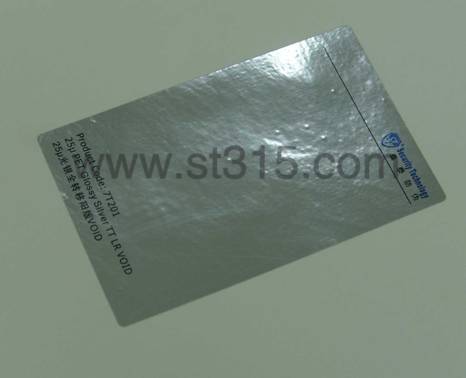桑泰7T201防偽材料為亮銀色,材料一旦被揭起,銀色的“VOID”字樣就會轉移到承貼物表面,同時“VOID”銀色(3MM高*11MM寬)也會顯現在標簽面材上,成鏤空狀,不可復原,以示已開啟。有效地阻嚇盜竊、竄貨等不法行為的肆行。
