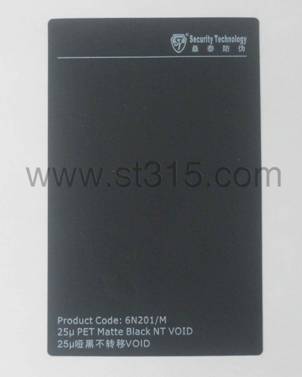 桑泰6N201/M為25#啞黑不轉(zhuǎn)移防偽材料,一旦被揭起,“VOID”字樣(3MM高*11MM寬)就會(huì)立刻顯現(xiàn)在標(biāo)簽面材上,而被貼物表面無任何殘留,保證了被貼物表面的清潔。標(biāo)簽破壞不可復(fù)原,以示已開啟。有效地阻嚇盜竊、竄貨等不法行為的肆行。