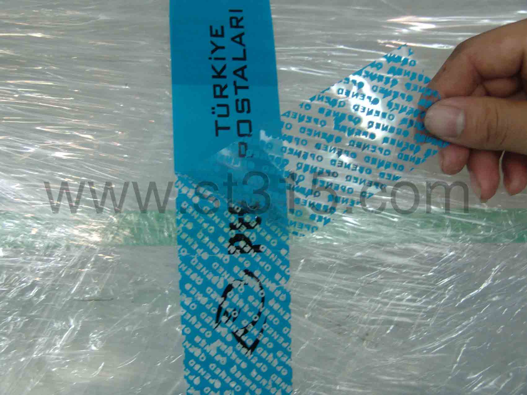 桑泰9T2108T為藍色全轉移型防偽膠帶。 揭起后,會有藍色鏤空的“OPENED”字樣轉移到箱體表面,同時也呈現在膠帶面材上,不可復原,以示已開啟。有效地阻嚇盜竊、竄貨等不法行為的肆行。